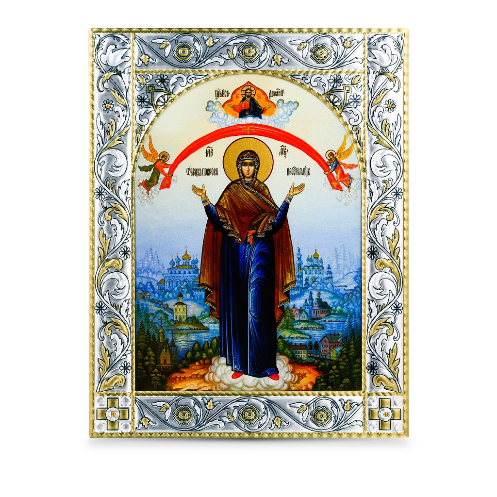 Размер иконы 140*180 мм. Рамка выполнена из сублимационного алюминия, покрытого посеребрёнными красками