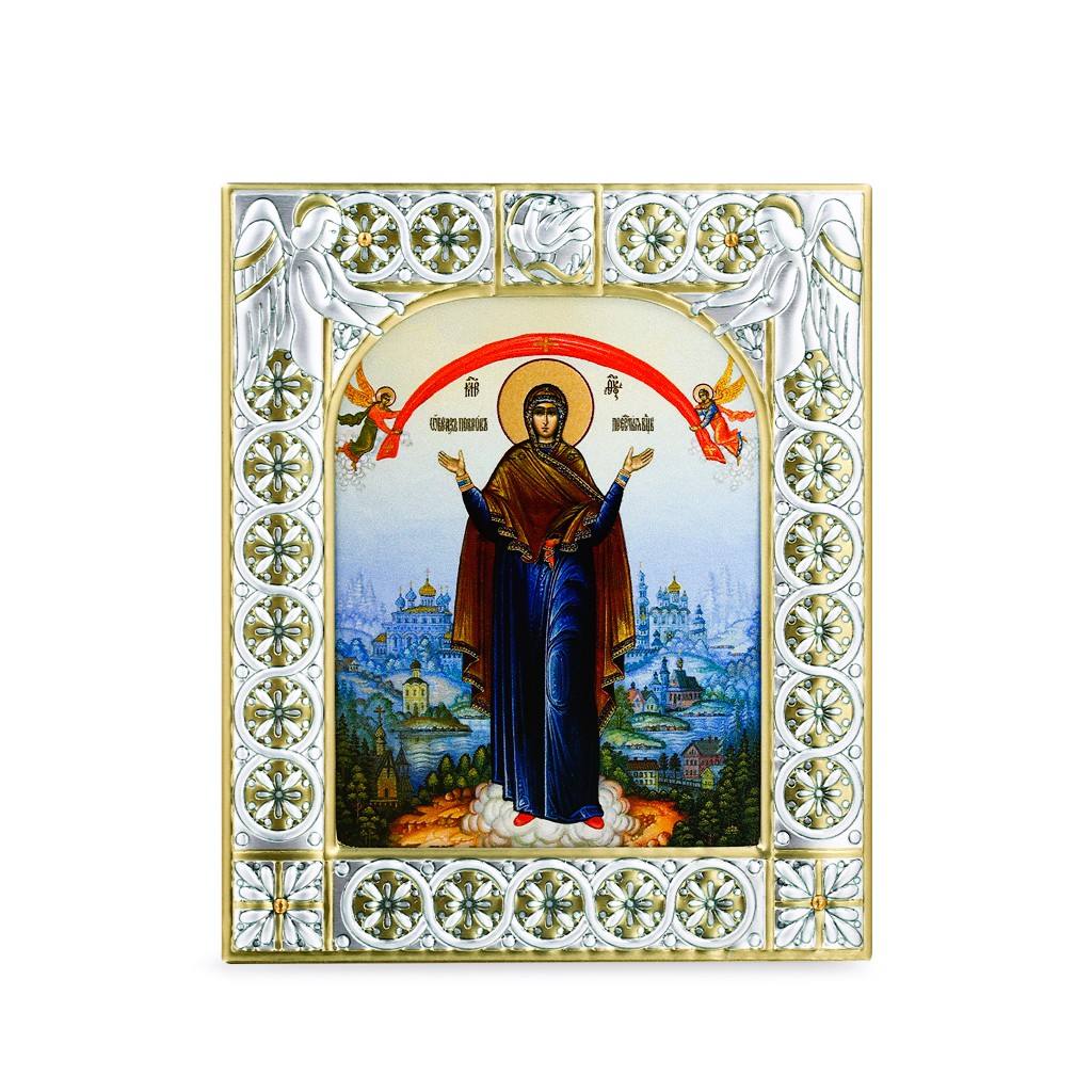 Размер иконы 88*104 мм. Рамка выполнена из сублимационного алюминия, покрытого посеребрёнными красками