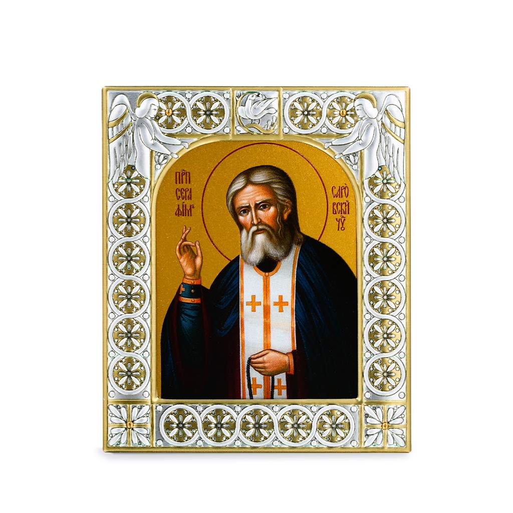 Размер иконы 88*104 мм. Рамка выполнена из сублимационного алюминия, покрытого посеребрёнными красками