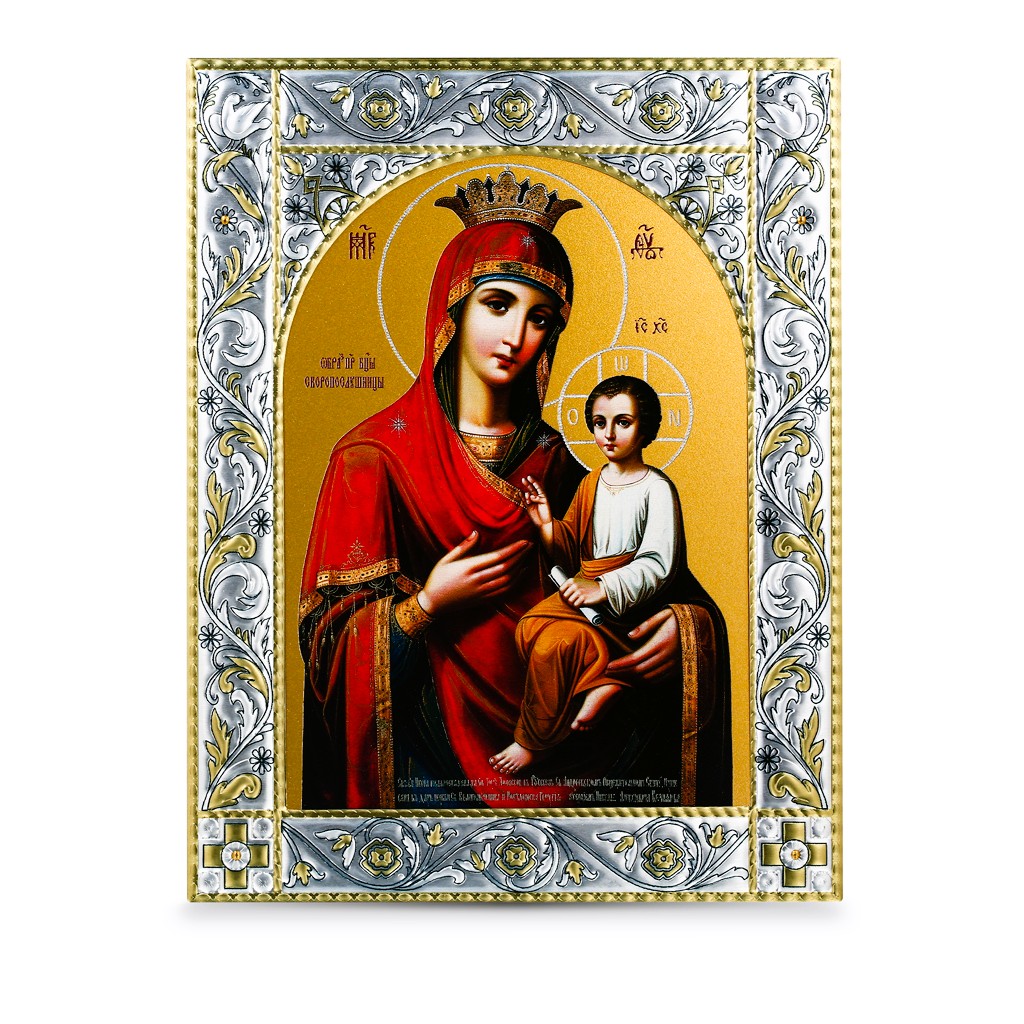 Размер иконы 140*180 мм. Рамка выполнена из сублимационного алюминия, покрытого посеребрёнными красками