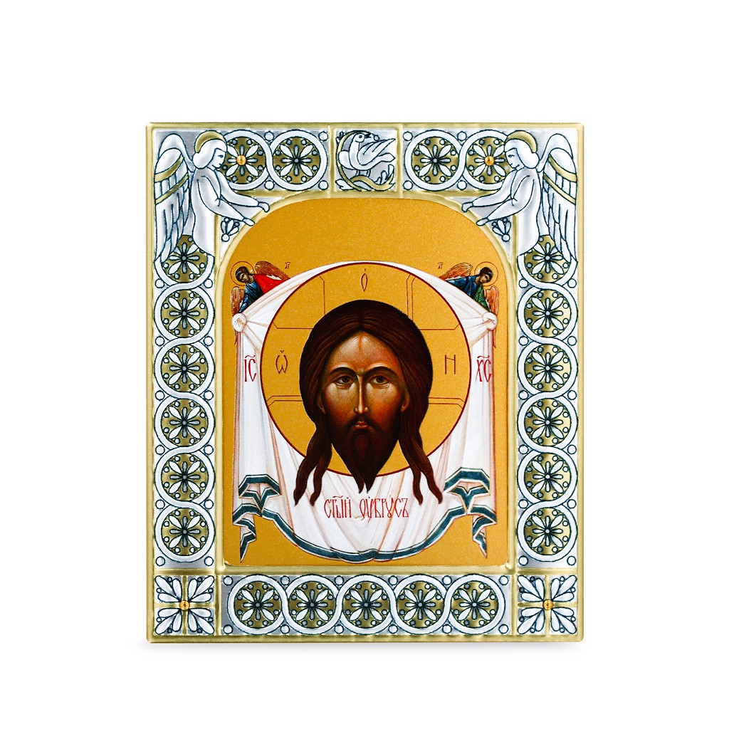 Размер иконы 88*104 мм. Рамка выполнена из сублимационного алюминия, покрытого посеребрёнными красками