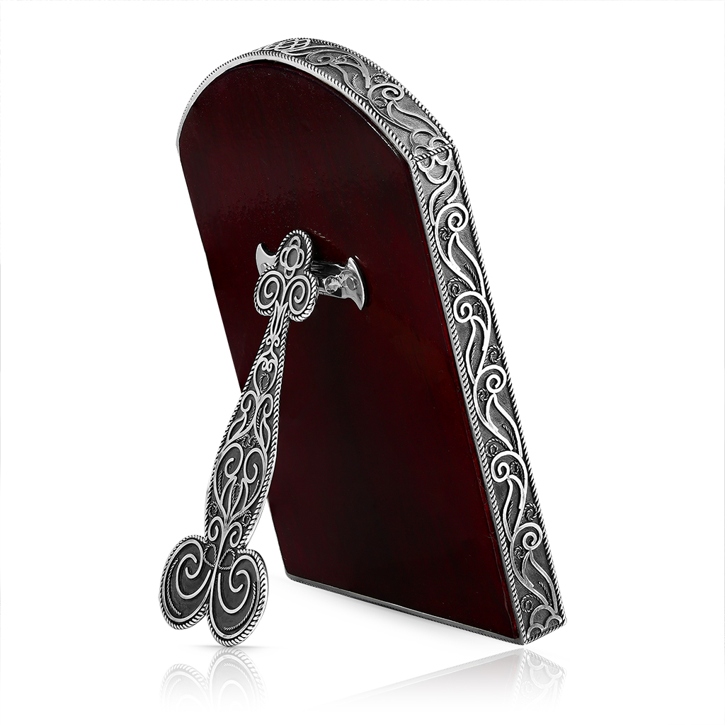 Оклад иконы выполнен из серебра 925 пробы с вставкой из граната. Лик святого написан на перламутровой вставке.
