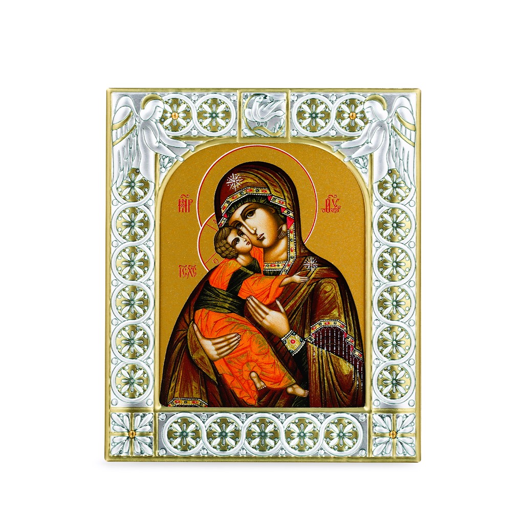 Размер иконы 88*104 мм. Рамка выполнена из сублимационного алюминия, покрытого посеребрёнными красками