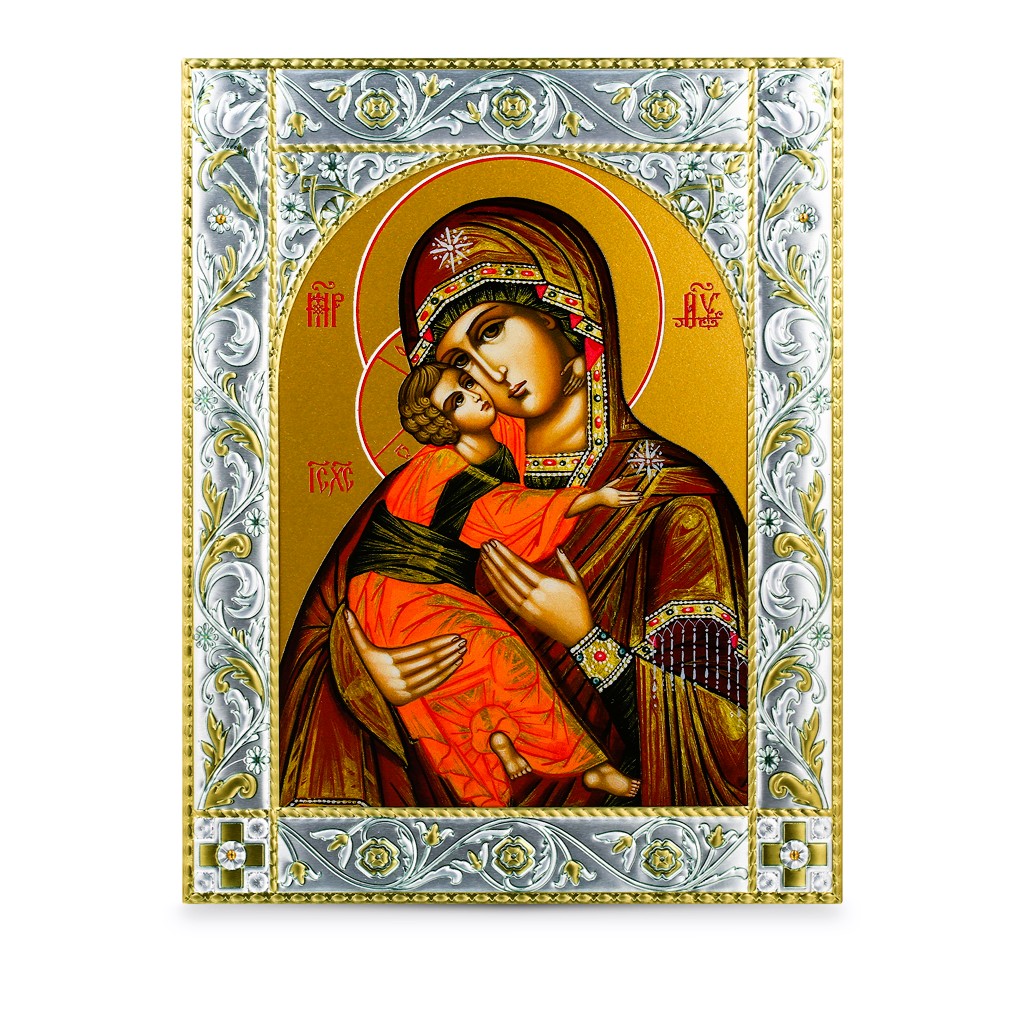 Размер иконы 140*180 мм. Рамка выполнена из сублимационного алюминия, покрытого посеребрёнными красками