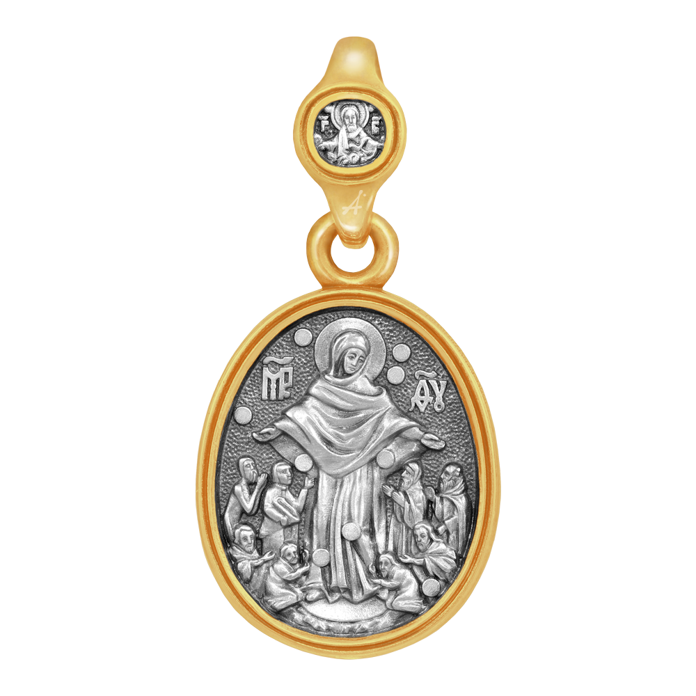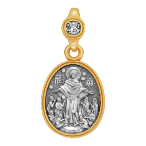 Небольшой образок посвящен чудотворной иконе Богоматери «Всех скорбящих Радость с грошиками». Эта икона — величайшая святыня Санкт-Петербурга, которая хранится в Троицкой церкви «Кулич и Пасха». На ней Богоматерь стоит в полный рост в окружении молящихся страждущих и несчастных людей, подавая им Свою милость и утешение.