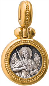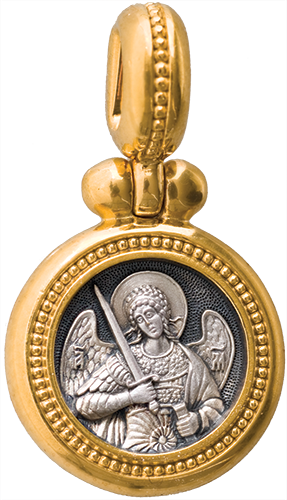 Маленькая иконка круглой формы с подвижным оглавием представляет собой рельефный поясной образ архангела Михаила. В основе выбранной иконографии лежит древнерусский иконописный извод, часто используемый в иконной мелкой пластике в XV–XVI вв. На нем архангел изображен как архистратиг – предводитель небесного воинства, в доспехах и с поднятым обнаженным мечом.
