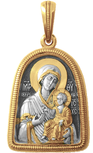 Иконка арочной формы представляет собой рельефное изображение почитаемой чудотворной иконы Божией Матери Иверской, относящейся к иконографическому типу Одигитрия.