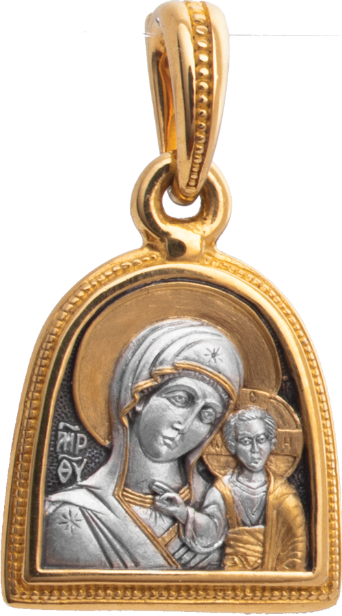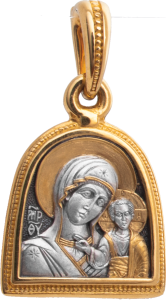 Иконка арочной формы представляет собой миниатюрное рельефное изображение великой всенародной святыни Казанской иконы Божией Матери.