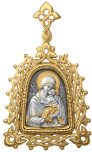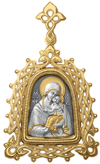 Нагрудная икона арочной формы в ажурной оправе в виде плетеного орнамента представляет собой рельефное изображение Ярославской иконы Божией Матери. Иконка может быть выполнена с подвижным оглавием в виде крина или дополнена ажурной цепью, повторяющей орнамент оправы и закрепленной на кольце в верхней части оправы.