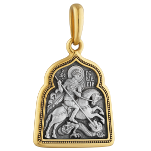 На лицевой стороне размещена икона «Чудо Георгия о змие», повторяющая известный новгородский извод XV в. Из множества чудес, совершенных св. вмч. Георгием после своей мученической смерти за Христа, самым знаменитым является его победа над порождением дьявола – громадным змием. Эта победа для всего христианского мира стала символом победы христианства над язычеством и торжества добра над злом. Недаром большая часть икон св. Георгия передает именно этот сюжет. В мелкой пластике это преобладание еще значительней, т.к. победе св. Георгия над змием придавалось особое, защитное от злых сил, свойство.