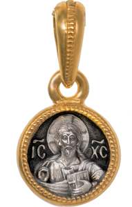 Миниатюрная иконка имеет форму круглого медальона, на сторонах которого размещены два главнейших образа: Господь Иисус Христос и Богородица. Такое сочетание часто встречается в церковном искусстве. Его основой является система росписей крестовокупольного храма, где вся сложная храмовая символика раскрывается вокруг двух главных образов – Господа Вседержителя в куполе и Богоматери в конхе апсиды.