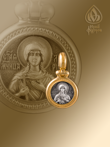 Маленькая иконка круглой формы с подвижным оглавием представляет собой рельефный образ святой мученицы Ларисы Готфской. Святая изображена погрудно. В правой руке она держит восьмиконечный крест, левая – прижата к груди. Из-под плата выбиваются пряди волос, свидетельствующие о ее девичьем достоинстве.