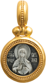 Маленькая иконка круглой формы с подвижным оглавием представляет собой рельефный поясной образ священномученицы Татианы. Святая представлена в традиционной иконографии с крестом в правой руке и со свитком в левой.