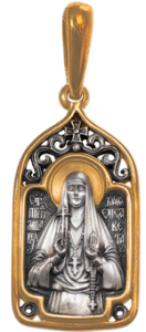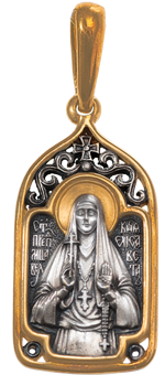 В иконографии данного образка мы попытались отобразить ступени духовного восхождения Великой княгини Елизаветы Федоровны. Они отмечены тремя крестами. Первый, самый нижний крест, – это крестик на четках в левой руке Великой княгини. Молитвенные четки сопровождали ее всю жизнь, начиная с юных лет. Это – символ молитвы, пробуждающей и питающей духовную жизнь. Несколько выше – второй крест – наперсный кипарисовый крест настоятельницы Марфо-Мариинской обители – символ ее иноческого служения. И, наконец, самый высокий – мученический Голгофский крест в правой руке святой преподобномученицы. Это победный крест, открывающий врата Царства Небесного.