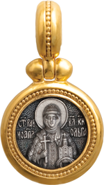 На оборотной стороне нашего образка изображен четырехконечный процветший крест в круге с традиционными надписями І&С Х&С НИКА (Иисус Христос Победитель). По окружности его обрамляют слова молитвы к святой на церковно-славянском языке: q с™az кнzги1не џльго, бyди нaмъ во всeмъ ко бла1гу пом0щница...