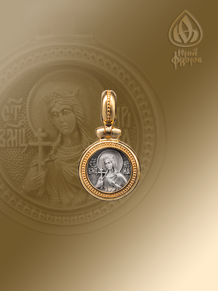 Маленькая иконка круглой формы с подвижным оглавием представляет собой рельефный поясной образ святой великомученицы Ирины. Святая изображена в традиционном иконографическом изводе. Она облачена в тунику и гиматий, на голове – диадема. Левая рука прижата к груди, в правой – восьмиконечный крест, как символ христианского мученичества.