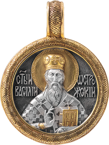 На лицевой стороне медальона изображен поясной образ святого Василия Острожского, повторяющий почитаемую икону, которую написала в 1992 г. инокиня монастыря Челия Пиперская. На ней св. Василий изображен в святительском облачении, увенчанный митрой. В левой руке он держит Евангелие, а правая сложена в благословляющий жест. На поле иконы – надпись имени святого.