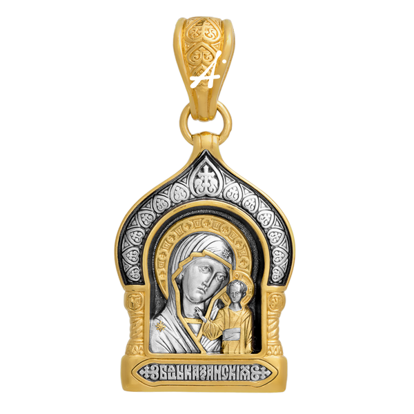 На образке изображена величайшая святыня России, самая любимая и почитаемая верующими икона Пресвятой Богородицы — Казанская. Чудотворный образ помещен в рамку киотной формы, украшенную символическим орнаментом, называемым «процветшие сердца».