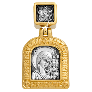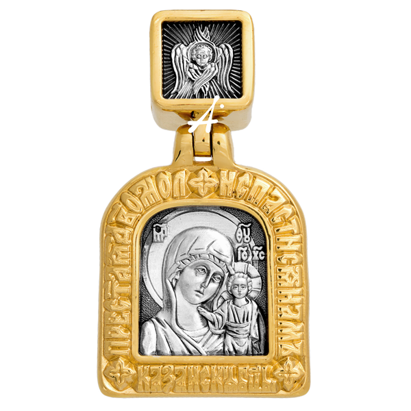 «Пресвятая Дево, моли спастися нам!» – написано на Казанском образке вокруг лика Пресвятой Богородицы. На обороте изделия помещен символический орнамент из двух голубей, смотрящих на восьмиконечную «богородичную звезду», и еще одна просительная молитва: «Милосердия двери отверзи нам, благословенная Богородица».
