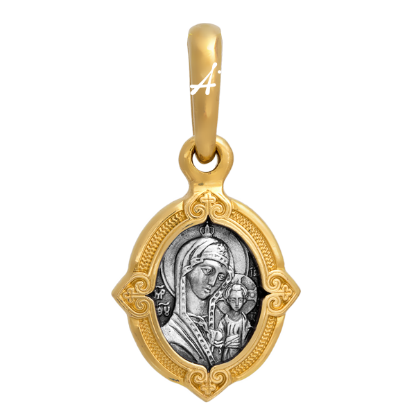 На образке изображена величайшая святыня России, самая любимая и почитаемая верующими икона Пресвятой Богородицы — Казанская. Чудотворный образ помещен в овальную форму, украшенную символическим орнаментом, называемым «процветшие сердца».