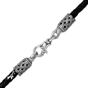 Шнур для ношения нательного креста сплетен из натуральной телячьей кожи глубокой окраски. Он не пачкает одежду и устойчив к воде. Застежка-карабин надежно крепится к шнуру с помощью винтов без использования клея. Подобный крепеж долговечен и легко разбирается самостоятельно, что дает возможность продеть шнур практически в любое ушко.