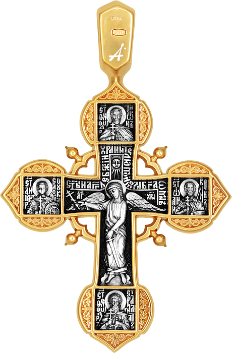 Крест очень древней формы, распространенный на Руси со Средних веков. Эта форма креста соединенного с кругом называется Никитрион, то есть «победный». Такие кресты устанавливались на местах победоносных сражений, укреплялись в стенах памятных храмов, носились на шее воинами-победителями. Окончания перекладин напоминают луковичные главы русских церквей, в каждой из которых помещена икона святого, покровителя Русской Земли.