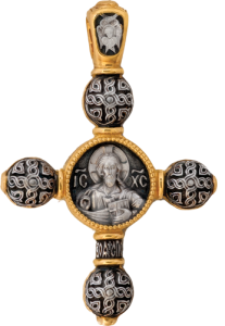 Небольшой крестик, близкий к греческим пропорциям, с круглым медальоном в средокрестии и сферическим завершением балок. Кресты подобной формы широко бытовали на Руси в XI–XIII вв. Они были найдены в Новгороде, Киеве, Старой Рязани, Костроме, Владимире, Туле, а также в Латвии и Эстонии. На многих из них в центральном медальоне присутствуют иконографические изображения. Из-за плохой сохранности нельзя с полной уверенностью сказать, чьи образы изображены на крестах. Скорее всего, это изображения Спасителя и Богородицы с ладонями, открытыми перед грудью.