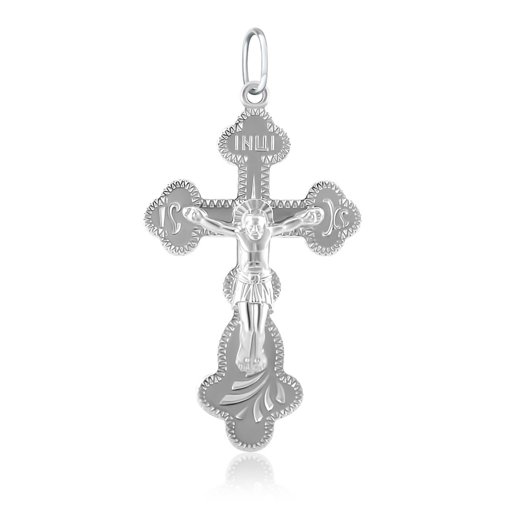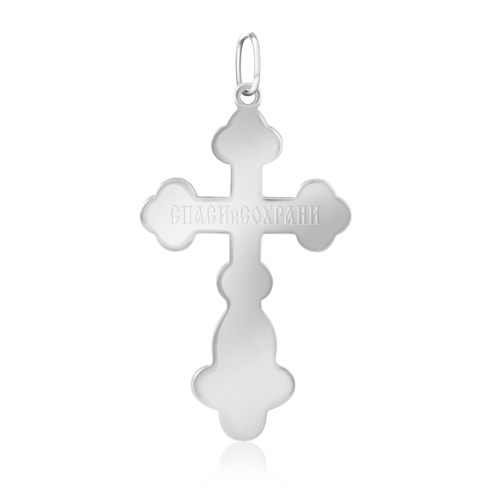 Небольшой изящный крест из белого золота. На лицевой стороне изображено Распятие Господа Иисуса Христа. На оборотной стороне оберегающая надпись "Спаси и сохрани". Соответствует канонам и изготовлено по благословению.<br><p><strong>Состав</strong>: Золото 585</p>