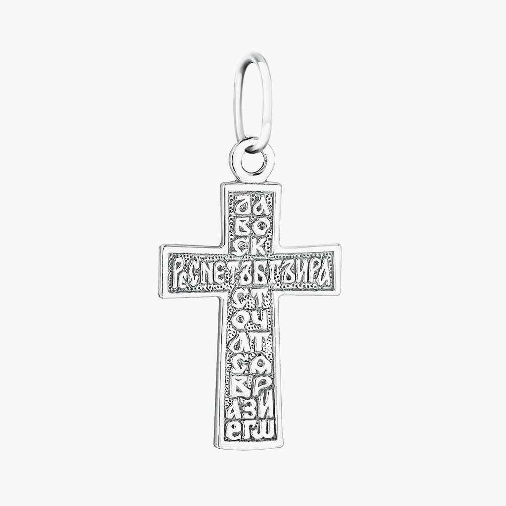 Крест из белого золота. На лицевой стороне изображено Распятие Господа нашего Иисуса Христа. На оборотной стороне оберегающая молитва "Да воскреснет Бог". Средний вес 1,1г