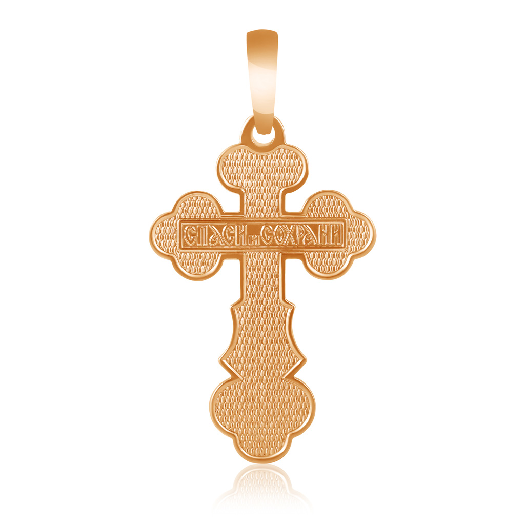 Изящный крест из красного золота. Выполнен в традиционной русской форме. Каждый из четырех концов перекладин заканчивается трилистником — символом Пресвятой Троицы. На лицевой стороне креста изображено Распятие из белого золота. На оборотной стороне оберегающая надпись "Спаси и сохрани". Соответствует канонам и изготовлено по благословению.<br><p><strong>Состав</strong>: Золото Au 585</p>