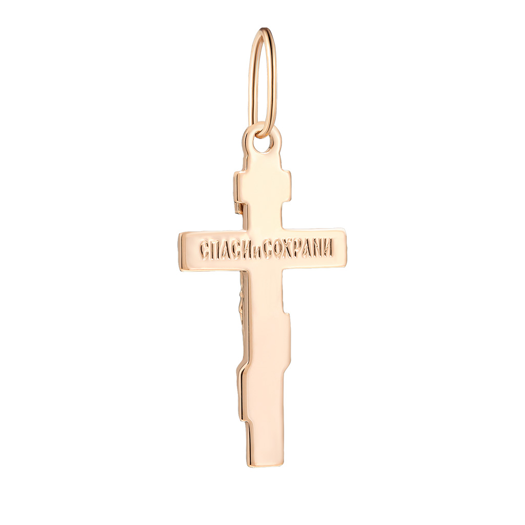 Нательный восьмиконечный крест из красного золота. На кресте изображено Распятие Господа нашего Иисуса Христа. На оборотной стороне оберегающая оберегающая надпись "Спаси и сохрани". Средний вес 1,37г. Выполнен из золота 585 пробы