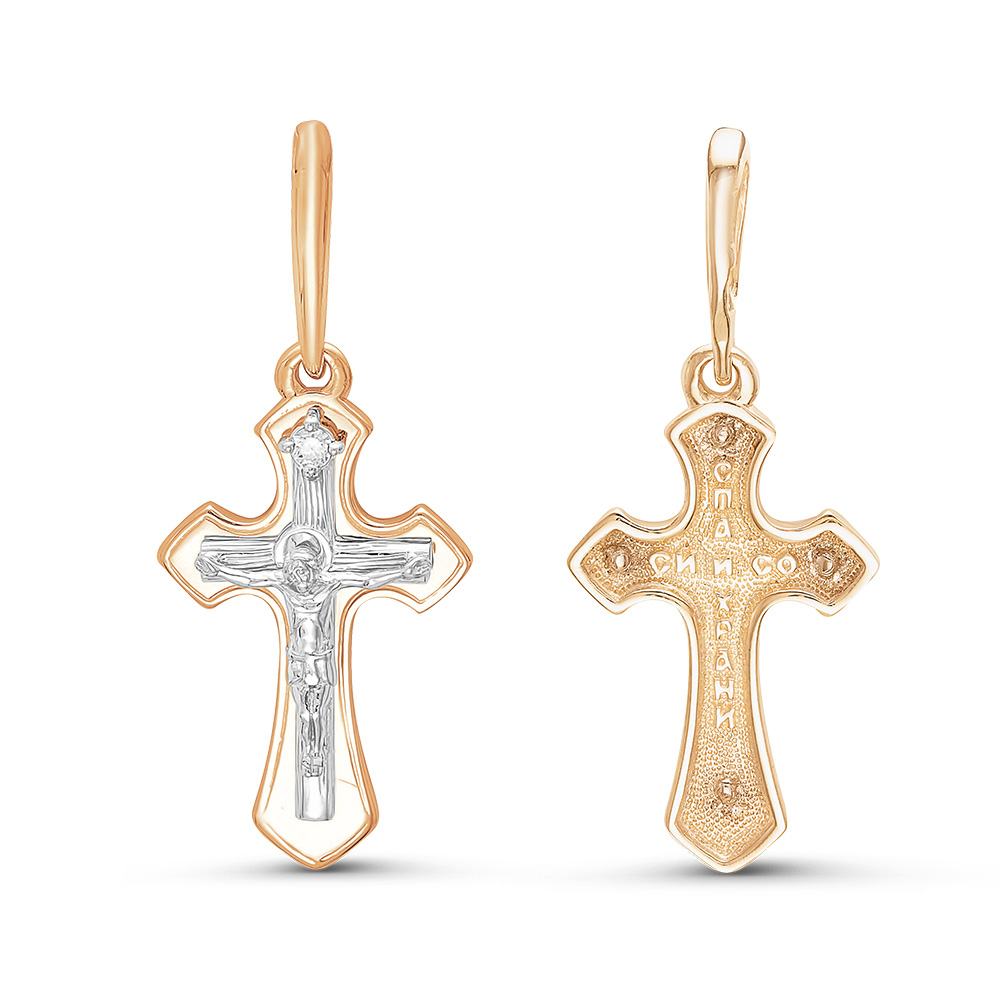 Небольшой крест из красного золота 585 пробы с бриллиантом. На лицевой стороне изображено Распятие Господа нашего Иисуса Христа, на оборотной стороне- оберегающая надпись "Спаси и Сохрани". Средний вес 1,12 г. Состав: Золото 585 пробы. Размер 25*11 мм (с ушком)