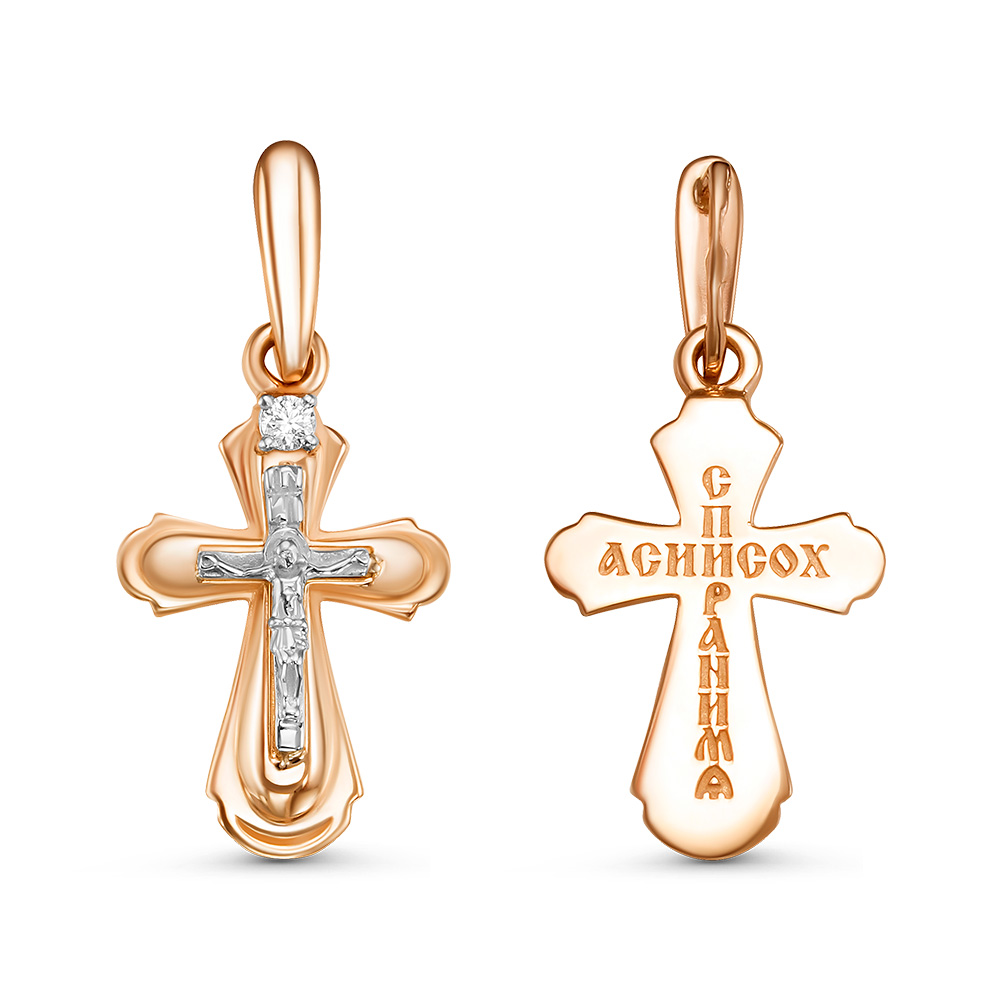 Изящный крест из красного золота с бриллиантом. На лицевой стороне изображено Распятие Господа Иисуса Христа. На оборотной стороне оберегающая надпись "Спаси и Сохрани". Средний вес 1,53 г. Состав: Золото 585 пробы. Размер 24*11 мм (с ушком)