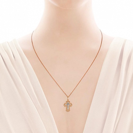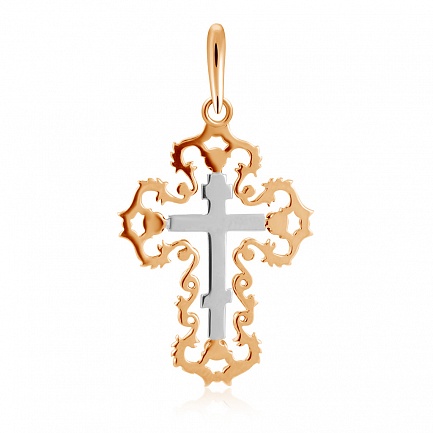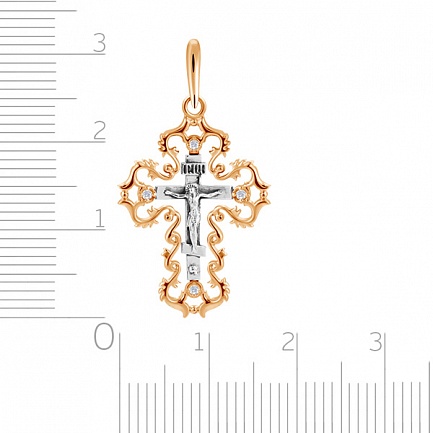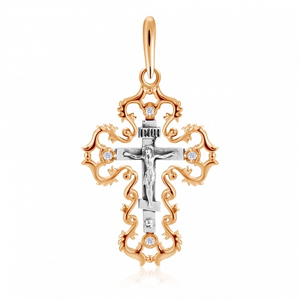 Изящный крест из красного золота с фианитами. Необычная форма креста придает ему особенную красоту. На лицевой стороне креста изображено Распятие из белого золота. Соответствует канонам и изготовлено по благословению.<br><p><strong>Состав</strong>: Золото Au 585</p>