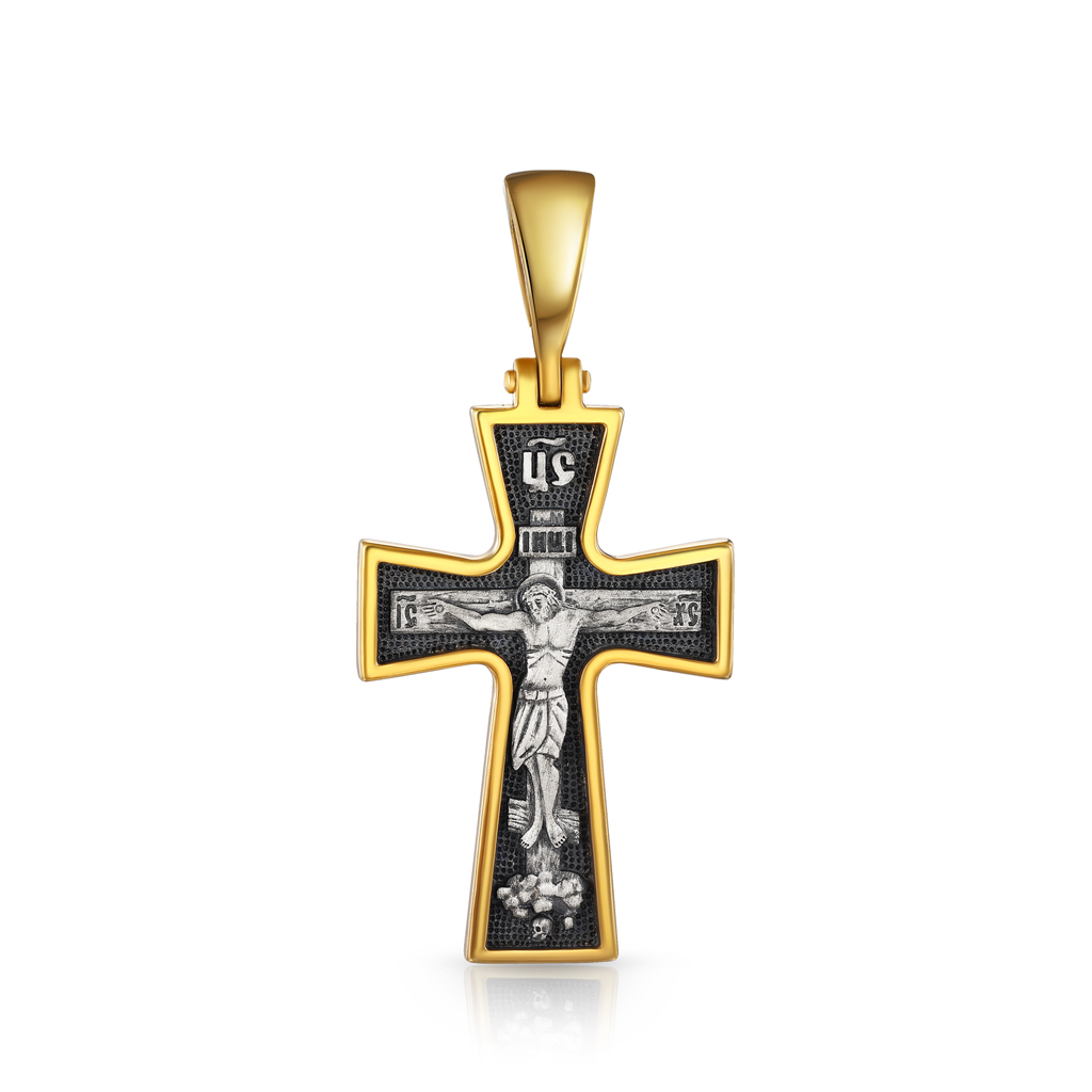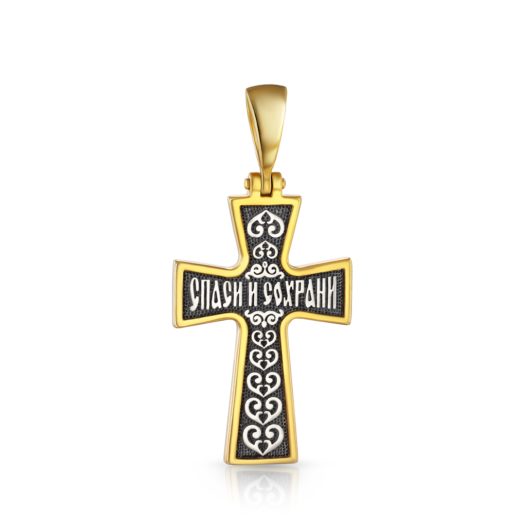 Серебряный нательный крест с позолотой. На лицевой стороне изображено Распятие Господа Иисуса Христа. На оборотной стороне надпись "Спаси и сохрани".<br />
