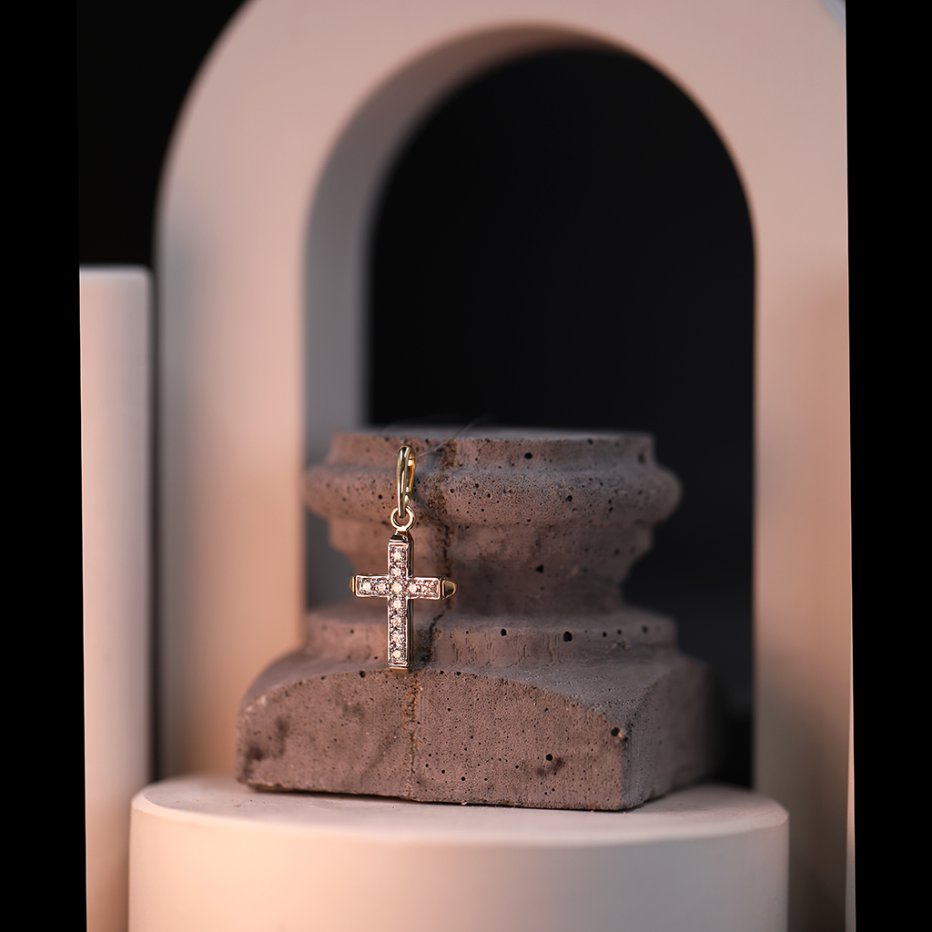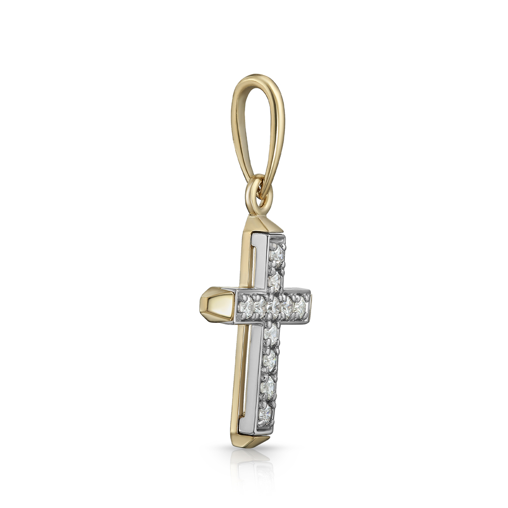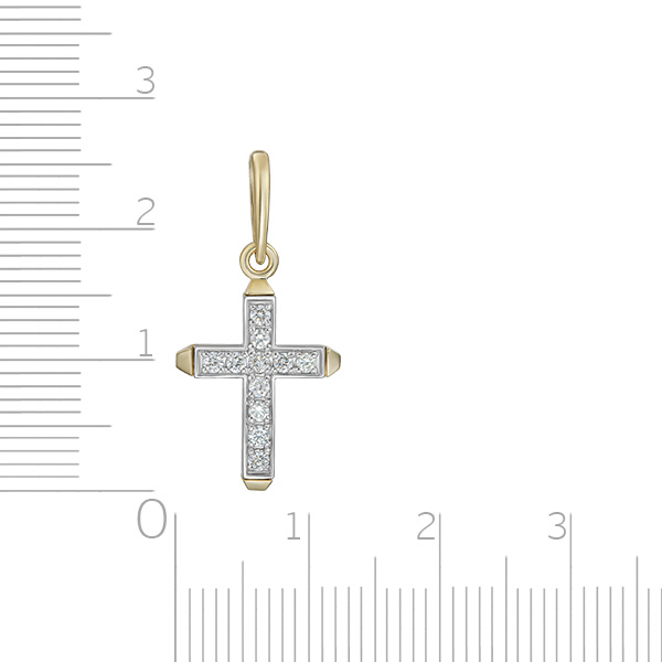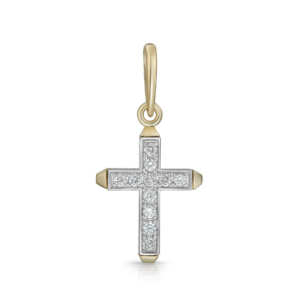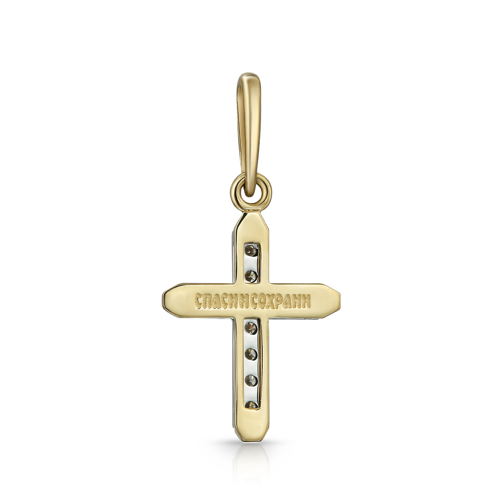 Изящный крест из желтого золота. Обладает притягательной эстетикой. Лицевая сторона креста украшена 11 бриллиантами. На оборотной стороне надпись "Спаси и сохрани". Соответствует канонам и изготовлено по благословению. Высота изделия 26 мм, ширина 12 мм. Выполнен из желтого золота 585 пробы с вставками из бриллиантов<br><p><strong>Состав</strong>: Золото 585</p>