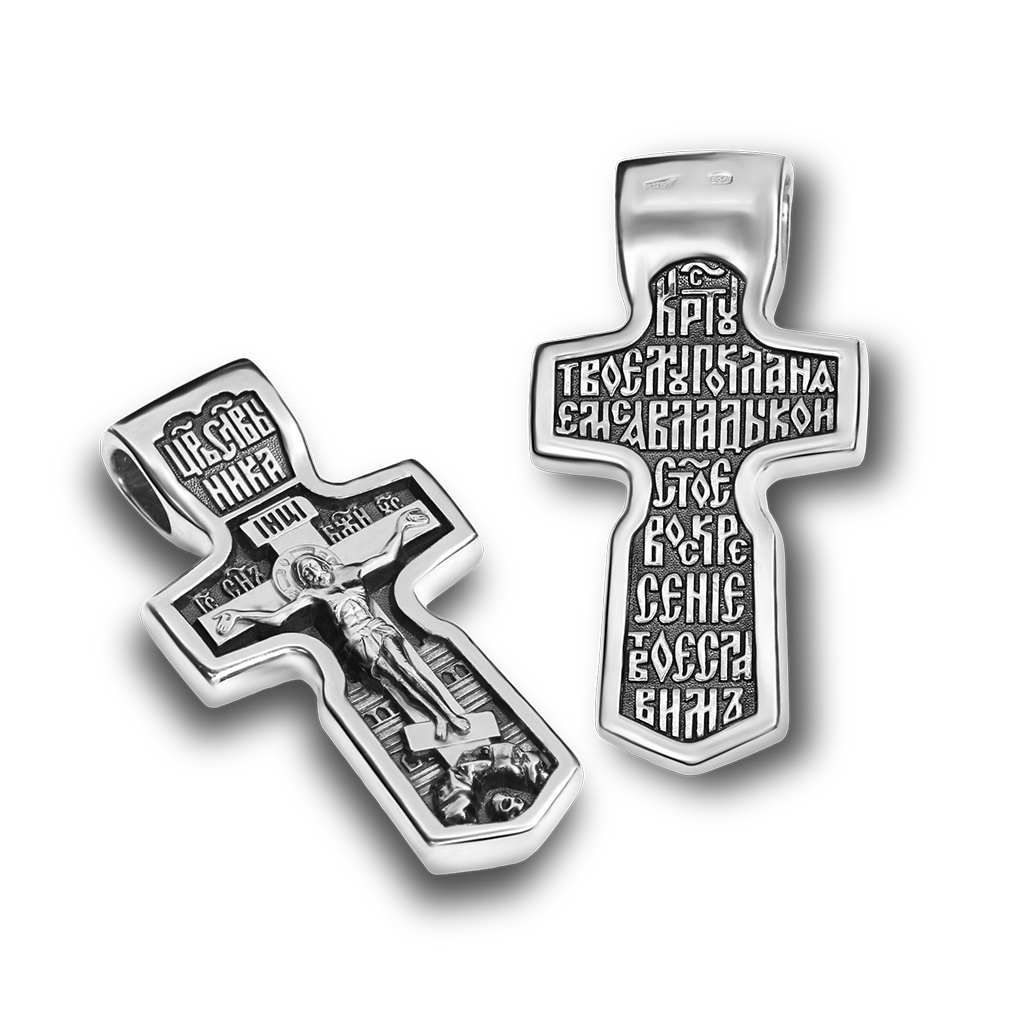 На лицевой стороне распятие с изображением распятого Спасителя, содержит в себе всю полноту силы, заключённой в Его крестном страдании. За распятием стена Иерусалима. На оборотной стороне – молитва: "Кресту твоему поклоняемся владыко и святое воскресение твое славим" (тропарь кресту).