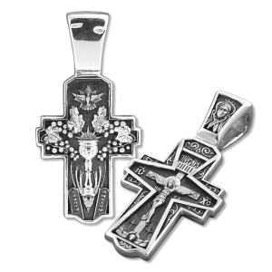 Изображение Распятия Христова обрамляет двойная рамка с изображением орнамента, который символизирует процветшее Древо Райское. В подножии Креста прах Первого человека Адама и два креста, посреди которых и был Распят Спаситель. (Лук. 23, 32 – 33) В оглавии лицевой стороны изображен пламенный Серафим. На оборотной стороне изображены скрижали Завета с десятью Заповедями. Скрижалью именуется и Пресвятая Богородица; она же — Почва невозделанная, из которой и произрос Хлеб Жизни – Христос (Ин. 6: 25). На это символически указывают изображенные колосья. В горизонтальной перекладине креста – обильно плодоносящая виноградная лоза. Ведь лозой именует себя Сам Христос (Ин.15:5). Именно вино и хлеб Иисус преподал на Тайной Вечери апостолам, указуя на них, как Своё на тело и кровь. В центре изображен потир (чаша) в который нисходит Солнце Правды — Христос, дабы пребывать и просвещать каждого, приступающего к святым Дарам. Над чашей возносится Дух Святой в виде голубя. Вся композиция указует на личность Христа и на центральное таинство христианской жизни — Евхаристию