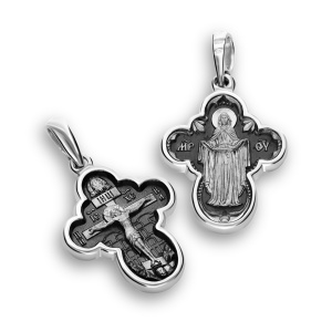 На лицевой части четырехконечного креста изображен Голгофский крест, над крестом Убрус, нерукотворный образ Христа Спасителя. В нижней части распятия Голгофа, прах первого человека, Адама и стена Иерусалима. На оборотной стороне креста ростовая икона Божьей Матери, простирающей покров Своего Честного Пояса. Пред Поясом Пресвятой Богородицы молятся о даровании чад, об укреплении своей малой церкви — Семьи.