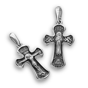 Четырехконечный крест – форма концов округлая, символ жизненной силы креста. Надписи: Царь Славы, Сын Божий и Ника образуют вертикаль прославления. На оборотной стороне изображение Святой Ксении Петербуржской, по бокам ей предстоят два ангела. В нижней части креста изображение Смоленской церкви, где блаженная Ксения подвизалась при жизни. Молятся святой, прося помощи в учении, браке, других жизненных проблемах.