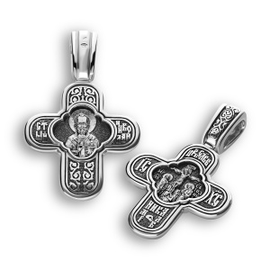 На лицевой стороне четырехконечного креста Голгофа (распятие с предстоящими перед ним Божией Матерью и Святым Иоанном Богословом, любимым учеником Спасителя). На оборотной стороне образ Святого Николая чудотворца. К нему обращаются в скорбях и болезнях, в путешествиях, незаслуженно обиженные и претерпевающие жизненные лишения.
