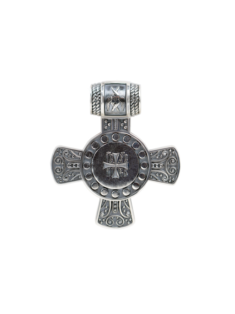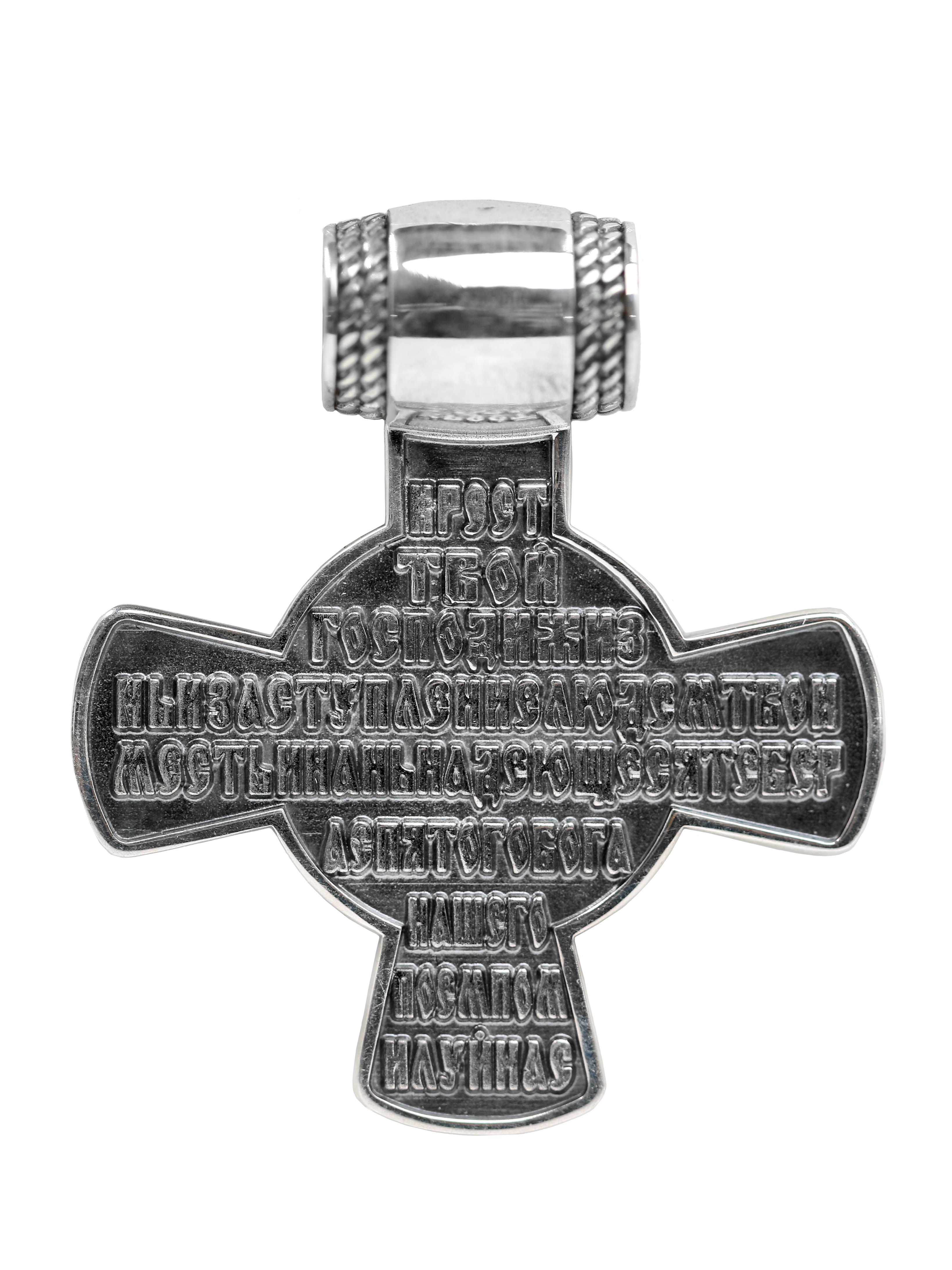 Подвеска представляет собой нательный Крест с молитвой "Крест Твой, Господи, жизнь и заступление людем Твоим есть, и нань надеющеся, Тебе распятаго Бога нашего поем: помилуй нас." Соответствует канонам и изготовлено по благословению.