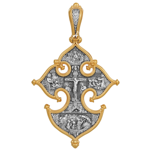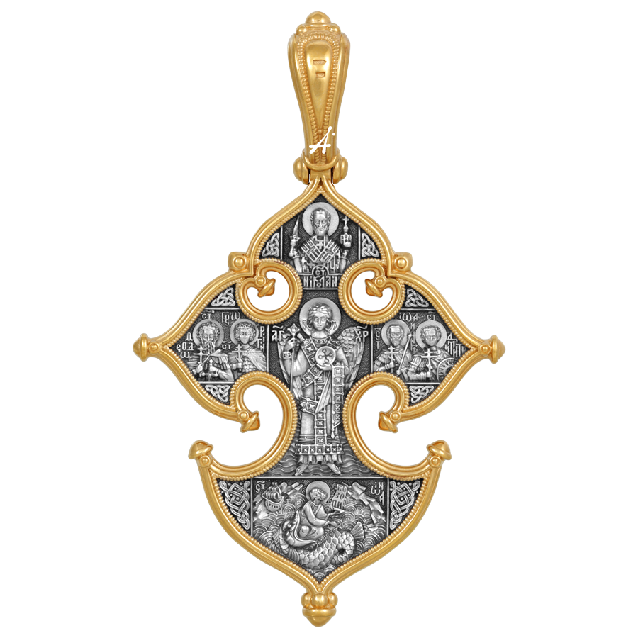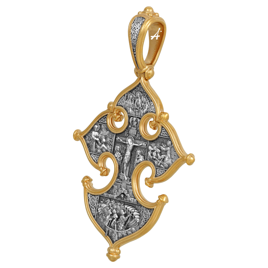 Крест «Православные чудеса» выполнен в традиции праздничных иконографических крестов. Его якорная орнаментальная форма, украшенная русскими «гирьками» и зернью, обилие мелкой пластики на сюжеты священной истории превращают его в настоящее праздничное украшение. Крупный необыкновенно красивый крест сделан специально для того, чтобы носить его поверх одежды. Еще в начале XX века такие кресты были обязательной частью парадного русского костюма. Женщины надевали их на узорчатые гайтаны вместе с бусами и ожерельями. На старинных фотографиях некоторых красавиц можно увидеть сразу несколько таких крестов. Мужчины надевали праздничный крест поверх рубашки, чтобы он был виден всем. Праздничные кресты были своеобразным публичным исповеданием веры, демонстрацией той радости, которую человек обретает в любви к Богу. Только в период гонения на Церковь в 20-е и 30-е годы праздничные кресты вышли из употребления. И сейчас, когда крест превратился в модное украшение, наша компания предлагает придать этой моде прежний духовный смысл.
