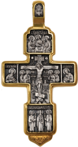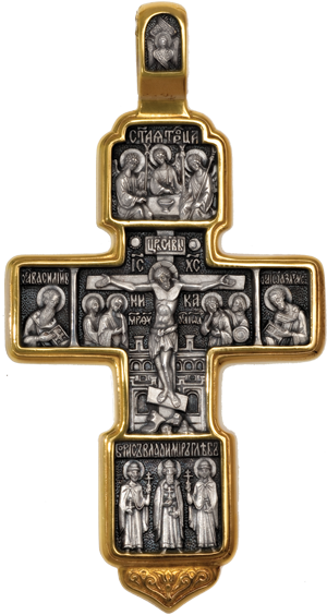 Сюжет Распятия никогда не был в православной иконографии только иллюстрацией казни Христа. С помощью надписей, символических элементов и художественных приемов его стремились показать как принесение искупительной жертвы Христом-Иереем, как таинство Небесной и Земной Церкви, а также как победу Христа и искупление человечества. Вмелкой пластике для усиления этой идеи сцена Распятия также часто дополнялась сюжетами и образами, не имеющими прямого отношения к евангельскому событию.