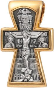 В центре нашего креста изображена фигура Христа, распятого на восьмиконечном кресте на фоне Иерусалимской стены. На верхней перекладине написано имя Господа І&С Х&С. Под распростертыми руками Спасителя – надпись НИКА (Побеждай). На горизонтальной балке креста – полуфигуры предстоящих: Божией Матери (надпись М&Р F&V) и Иоанна Богослова (надпись оа7гi iw8). Внизу креста – гора Голгофа и пещера с Адамовой главою. В верхней части креста – изображение Этимасии (уготованного престола). В нашем случае, когда присутствуют символы: Бога Отца – Престол, Бога Слова – Евангелие и Бога Духа Святого – голубь, Этимасию следует понимать как символ Пресвятой Троицы.