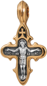 для упомянутых энколпионов. На лицевой стороне креста в углублении расположено рельефное изображение Распятия. Фигура Христа прямая, со слегка склоненной вправо головой. Под простертыми руками Спасителя надпись – І&С Х&С НИКА (Иисус Христос Победитель). Такую иконографию распятого Спасителя, характерную для большинства древних крестов, часто называют образом Христа-Триумфатора. Крестная смерть Спасителя в ней не затеняет торжество Господа, победившего ад и смерть. Возможно, что по этой же причине на многих древних нагрудных крестах не изображалось само крестное древо, но непременно присутствовала его нижняя часть – подножие, которое, согласно византийскому церемониалу, означает величие изображаемого лица и тем самым показывает Спасителя как Царя Славы. «Возносите Господа Бога нашего, и покланяйтесь подножию ногу Его, яко свято есть», – говорится в словах псалма (пс. 98:5). Для нас важно, что этот же стих псалма выбран и для прокимена на литургии в праздник на Воздвижение Честного Креста и связан с поклонением Кресту. В нашем кресте мы следуем описанной выше древней традиции.Так же в нашей работе присутствует и еще одна важная деталь, характерная для древних энколпионов, – это изображение креста над головой Спасителя. На некоторых древних энколпионах его роль выполняет выступающая верхняя часть крестного древа с «пилатовой дщицей», изображаемая в виде креста правильных греческих пропорций. Но существует целый ряд энколпионов, в которых крест над головой распятого Христа выполнен как цельный и самостоятельный образ, иногда даже с элементами цветения. В этом случае он является образом Креста Господня и в сочетании с Распятием образует символическую композицию, которая в контексте православной литургики и иконографии устанавливает связь с обрядом Воздвижения Честного и Животворящего Креста Господня, хорошо знакомого по церковным службам и многочисленным иконам праздника Воздвижения. Сам Спаситель становится исполнителем обряда. Он как бы воздвигает свой Крест нам на поклонение. Кроме того, обозначается связь Христа и Адама через Крест Господень. Всем известно традиционное изображение под Голгофским Крестом Адамовой главы как символа искупления первородного греха. Оно, появившись в IX в., в дальнейшем стало почти обязательным атрибутом Голгофского Креста. В нашем случае, когда Крест находится над головой Спасителя, а изображение Адамовой главы отсутствует, Христос вмещает в себя и образ Адама. Согласно Святоотеческому учению, Спаситель стал Новым Адамом, искупившим первородный грех и открывшим человеку путь к Жизни Вечной. В службе праздника Воздвижения также неоднократно упоминается связь Креста и Адама. А в самом обряде Воздвижения иерей, устанавливая Крест на голове, не только повторяет действия иерусалимского патриарха Макария, но и тем самым символизирует своей головой Адамову главу. Так предельно лаконичная композиция Распятия через погружение в церковный обряд позволяет передать в полной мере как кенозис (умаление), так и величие Спасителя, а также торжество его победного оружия – Честного и Животворящего Креста.