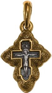 Маленький нательный крестик по форме сходен с русскими крестами-мощевиками XIV–XV вв. Края креста имеют плавные килевидные окончания, что напоминает изображения ангельских сил.