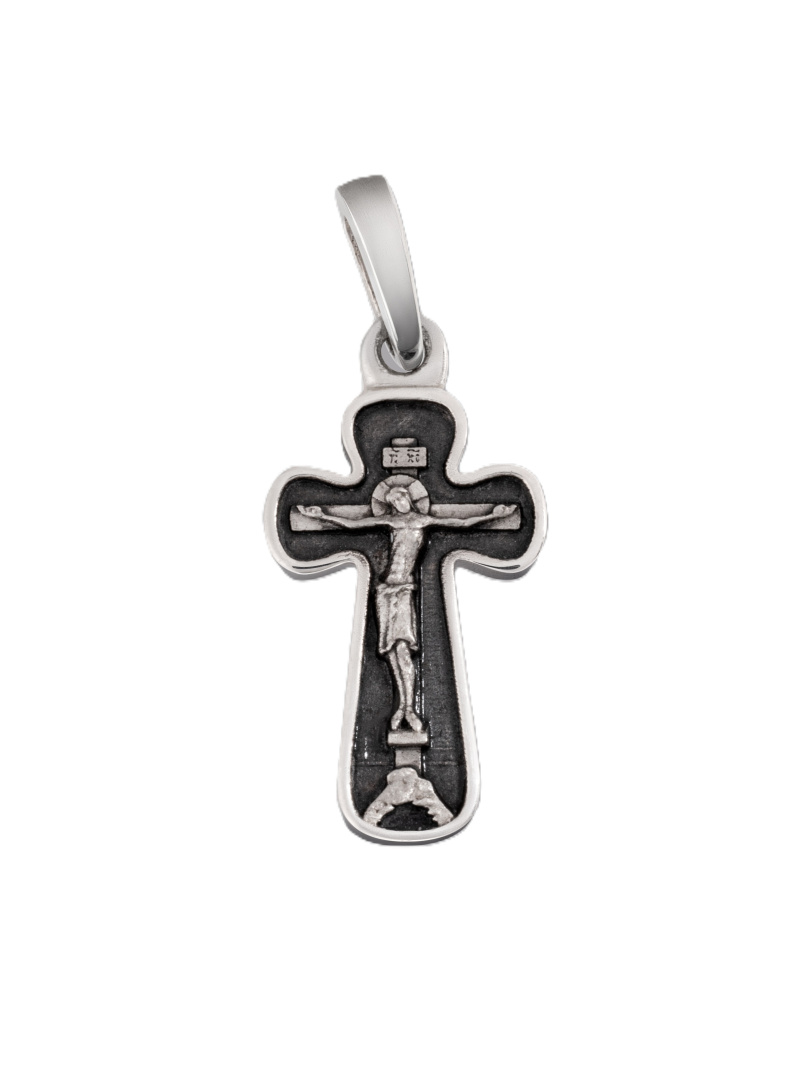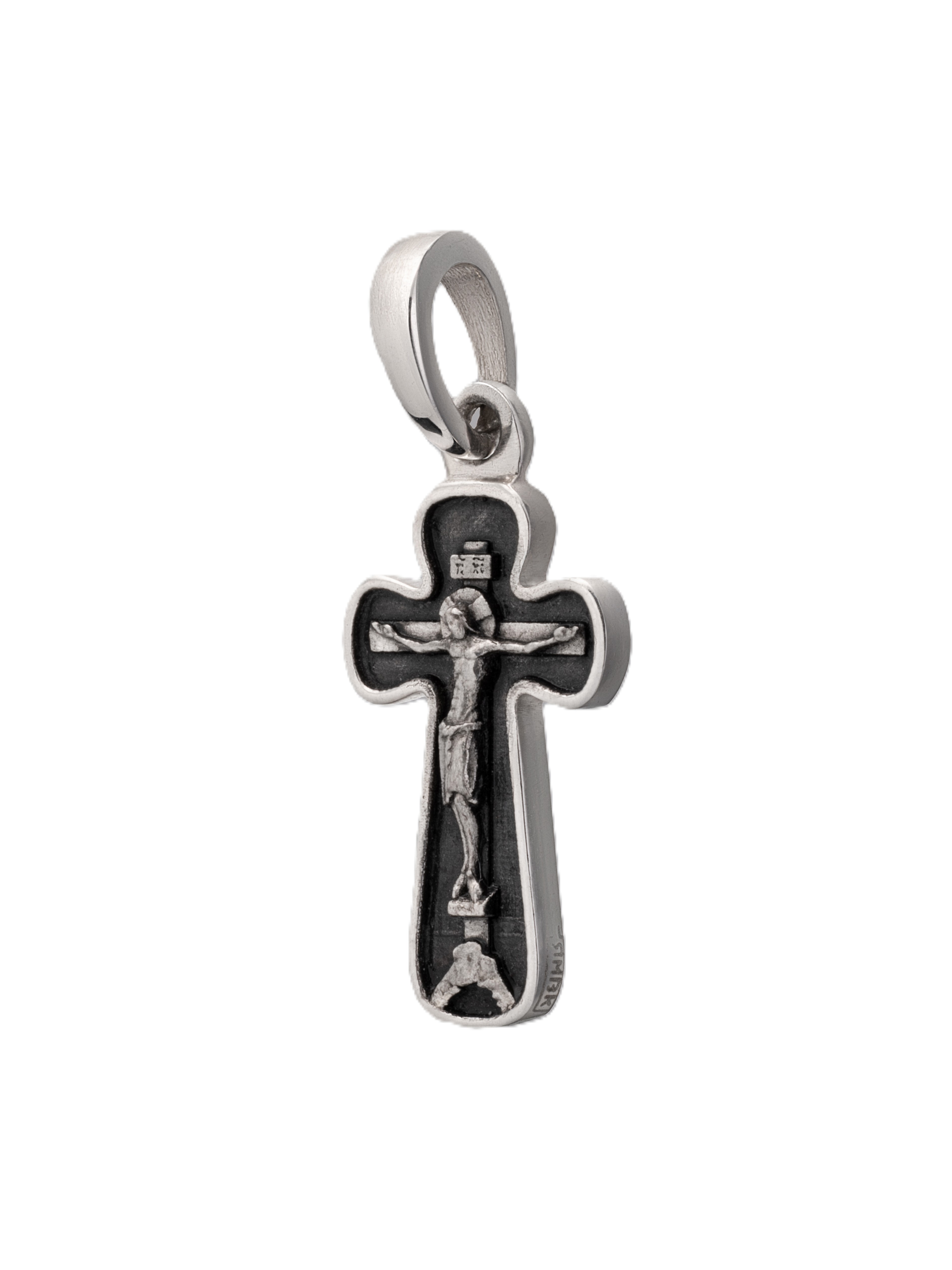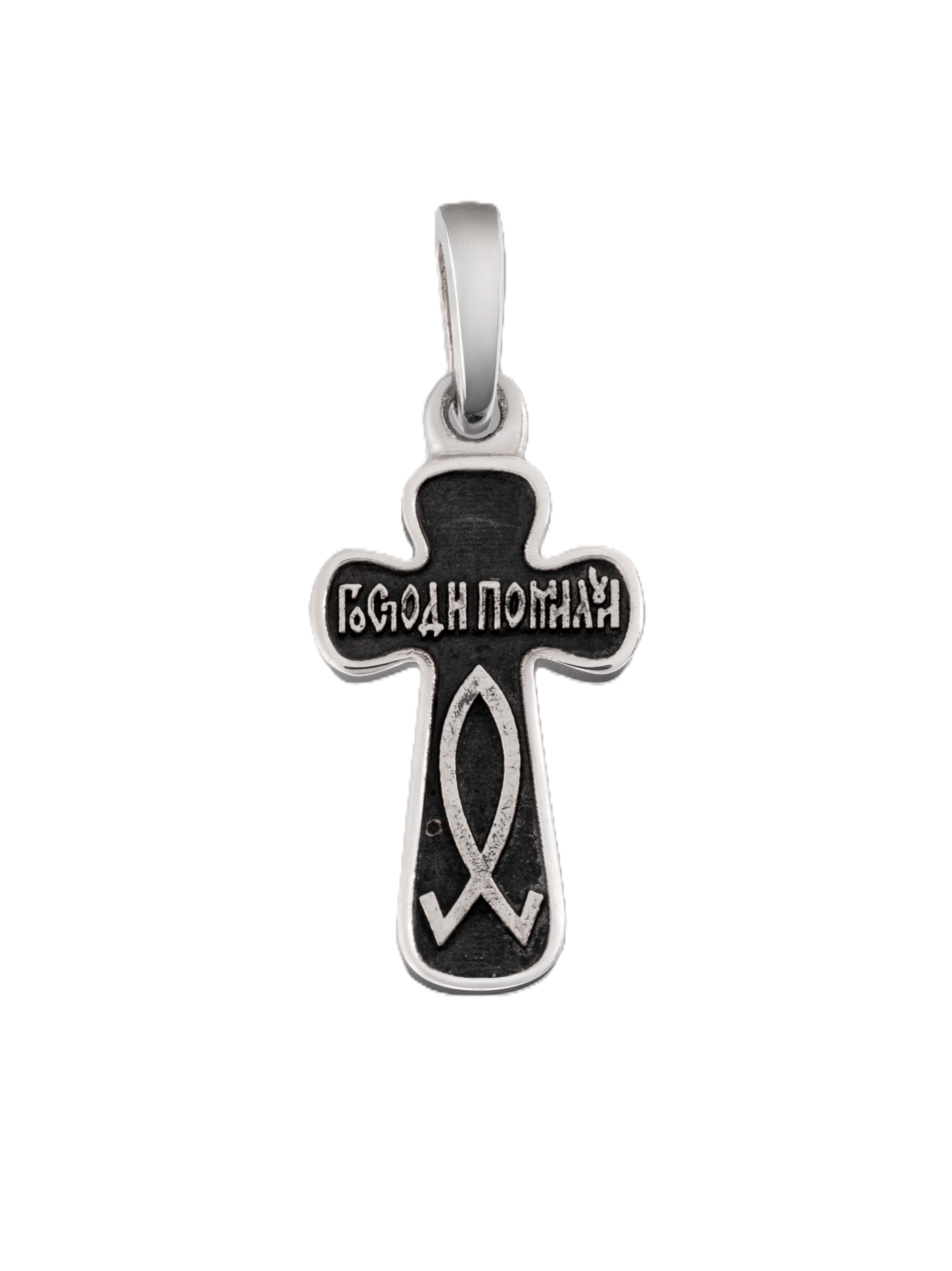 Подвеска представляет собой крестик ИХТИС - Акроним (монограмма) имени Иисуса Христа, состоящий из начальных букв слов: Ἰησοῦς Χριστός, Θεοῦ Υἱός, Σωτήρ (Иисус Христос Божий Сын Спаситель). На лицевой стороне изображено распятие Господа, на оборотной стороне фраза: Господи Помилуй и знак рыбы (знак Христианства). Соответствует канонам и изготовлено по благословению.