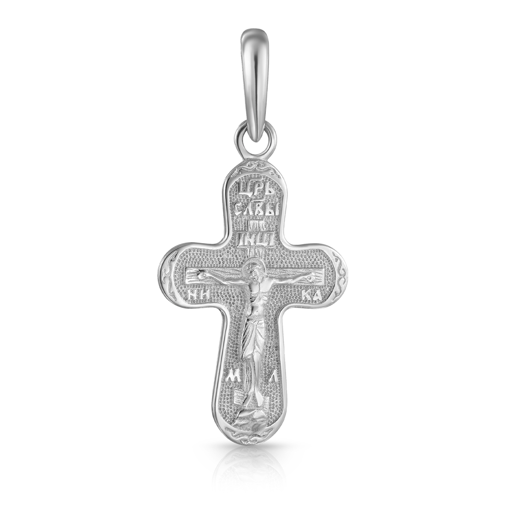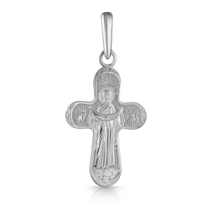 Крест из серебра 925 пробы с родированным покрытием. На лицевой стороне изображено Распятие Иисуса Христа. На оборотной стороне изображена икона Покров Пресвятой Богородицы. Размер 30*15 мм, средний вес 2г