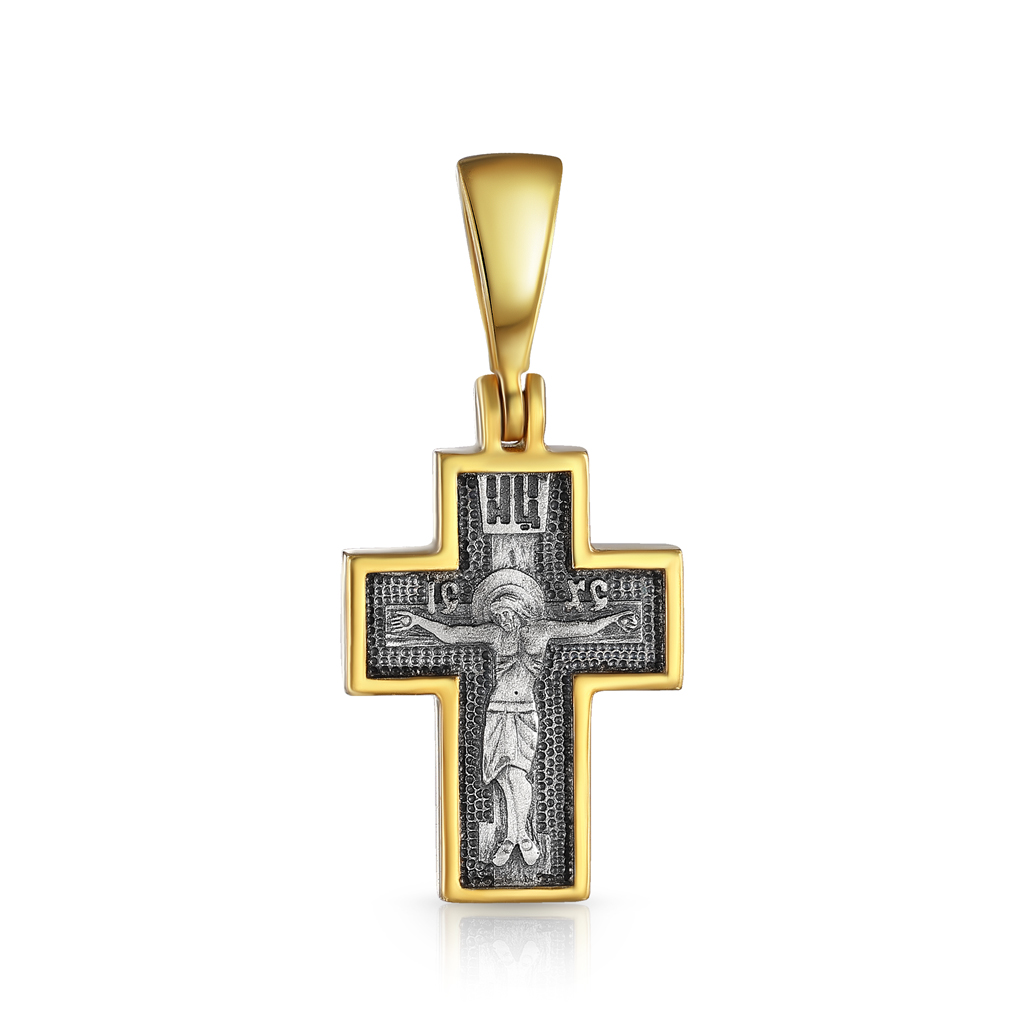 Серебряный нательный крест с позолотой. На лицевой стороне изображено Распятие Господа Иисуса Христа. На оборотной стороне молитва «Господи спаси и сохрани мя и помилуй».<br />